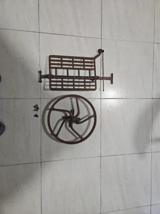 Pieza de repuesto para máquina de coser antigua SIGMA. Se trata del pedal. - Material: Metal. - Diseño: Rejilla superior y rueda. - Color: Marrón óxido.