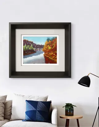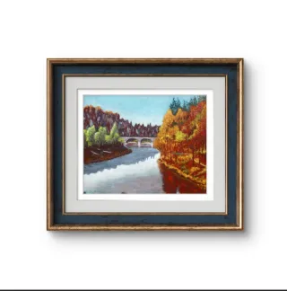 Preciosa pintura al óleo de un paisaje fluvial con un puente. Marco no incluido. - Técnica: Óleo sobre tablero imprimado.. - Motivo: Paisaje otoñal con río y puente. - Colores vibrantes y texturas ricas. Medidas. 46×38 cm. Año 2025