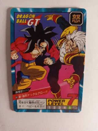 Carta de colección de Dragon Ball GT. - Personajes: Goku SSJ4 y Baby. - Ataque: ¡激!強烈ナックルアロー!!. - Nivel de poder: 7.