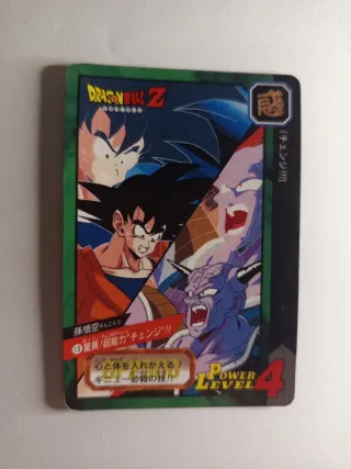 Carta coleccionable de Dragon Ball Z. - Ilustración de Goku y otros personajes. - Incluye el número de Power Level 4. - Texto en japonés y Power Level en inglés.