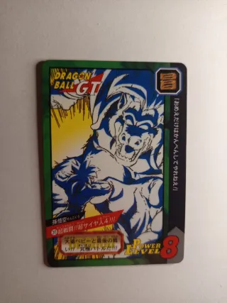 Carta de Dragon Ball GT con temática de Power Level. - Personaje: Son Goku - Serie: Dragon Ball GT - Poder: Nivel 8 - Habilidad: ¡Super Kamehameha! - Ilustración: Son Goku en Super Saiyan 4