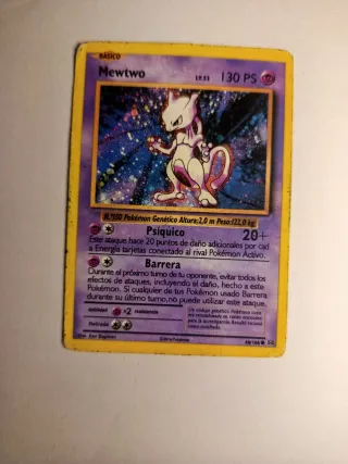 Carta Pokémon de Mewtwo, edición básica. - Nivel 53. - Ataque Psíquico con daño adicional por energía. - Habilidad Barrera para el próximo turno del oponente. - Debilidad x2. - Coste de retirada de 2 energías.
