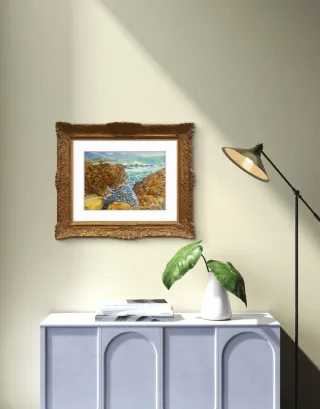 Preciosa pintura al óleo de un paisaje marino con rocas y el mar. Realizada sobre lienzo. - Técnica: Óleo sobre lienzo. - Marco no incluido. - Medidas. 38×30cm.