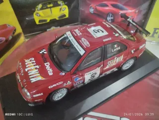 Réplica detallada de un coche de carreras Alfa Romeo a escala 1:18. Presenta un diseño deportivo y llamativo. Se vende en vitrina - Decoración Selenia y Larini. - Detalles de patrocinadores como Mahle y LG. - Incluye alerón trasero.