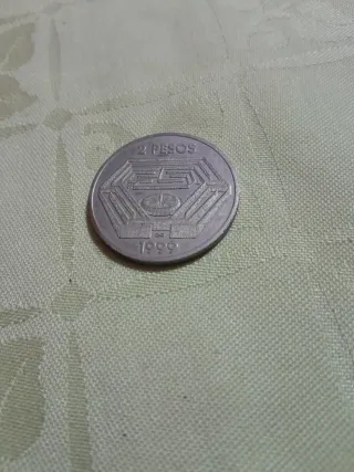 Moneda de 2 pesos argentinos con el diseño del año 1999. - Diseño con un patrón geométrico. - Inscripción 2 PESOS en la parte superior. - Año 1999 en la parte inferior.
