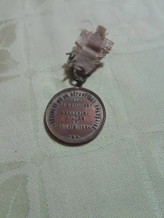 Medalla antigua con un retrato grabado en relieve. Presenta un diseño circular con un borde decorado. - Detalle de retrato masculino. - Inscripción en el borde. - Incluye cinta de tela deshilachada.