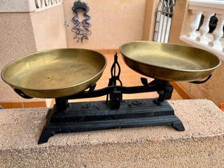 Balanza vintage con un diseño clásico y elegante, ideal para añadir un toque retro a tu hogar o negocio. - Platos de latón. - Base de hierro fundido. - Mecanismo de pesaje.