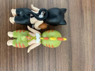 Se venden dos figuras tipo Sonny Angel, son imitaciones. - Una figura lleva un traje negro con tirantes y un muslo de pollo. - La otra figura lleva un traje verde con detalles naranjas y un casco de dinosaurio.