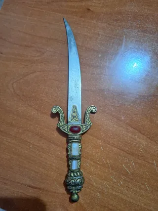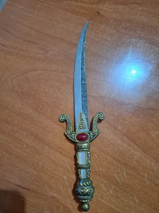Daga ornamental con detalles dorados y piedra roja. - Hoja curva de metal. - Empuñadura con incrustaciones y adornos. - Ideal para coleccionistas.