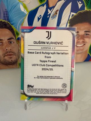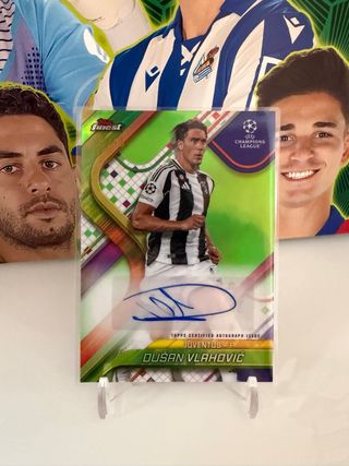 Tarjeta de colección de Dusan Vlahovic de la marca Topps Finest. - Edición Certified Autograph Issue. - Incluye firma del jugador /99 - Pertenece al equipo de la Juventus. - Serie Champions League.