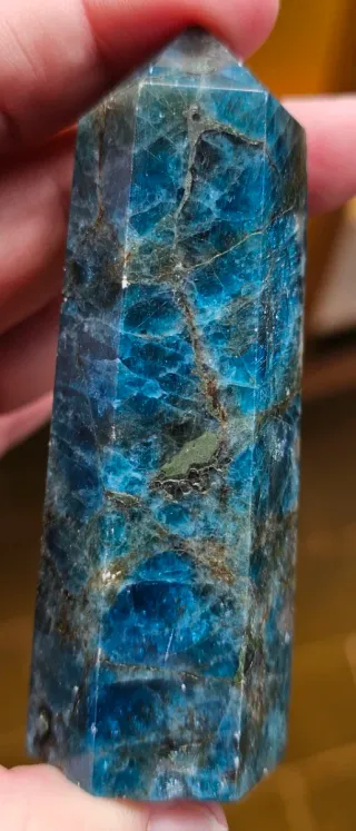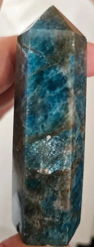 Hermosa punta de apatito azul, con reflejos. Medidas 8,63x2,63 cm