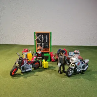 Set de Playmobil con motoristas y un taller. - Dos motoristas con cascos. - Motocicletas detalladas. - Accesorios de taller. Sigue mi perfil para más playmobil.