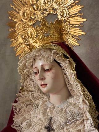 Se vende virgen dolorosa de 80cm completa, ataviada. Manto de terciopelo de algodón Salla en tisú de plata Corona de Alpaca cincelada bañada en oro hecha a medida Se regala peana de madera. (Tiene mas ropa, pregunta sin compromiso)