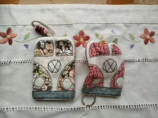 Llaveros de la clásica furgoneta hippie Volkswagen hechos a mano con la técnica Patchwork. El llavero funciona con una anilla interna. Tira de la cuerda para recogerlas. Tiene un cierre metálico para evitar que se salgan una vez recogidas. Mantén tus llaves bien ubicadas y guardadas en el bolso para que no se enreden con otras cosas. Medidas: 12cm x 8cm ¡Diseños únicos!