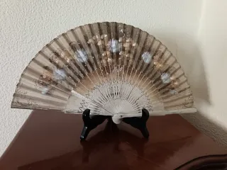 Precioso abanico antiguo con un diseño pintado a mano. Ideal como pieza decorativa. - Varillas de madera y tela pintada. - Motivo paisajístico con árboles y agua. Precio consultar por privado