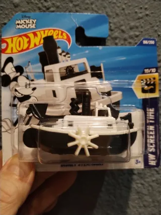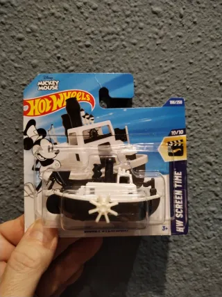 Coche de juguete Hot Wheels Steamboat de Disney, con diseño de Mickey Mouse. - Modelo: Steamboat. - Colección: HW Screen Time. - Serie: 10/10. - Número de pieza: 166/250. - Edad recomendada: 3+.