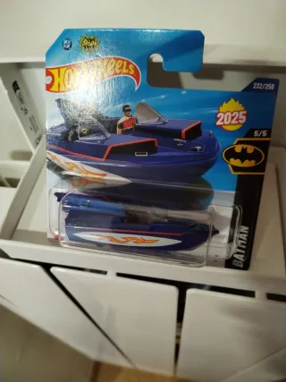 Réplica del Batboat de 1966 de Hot Wheels. - Diseño inspirado en Batman. - Color azul con detalles naranjas y blancos.