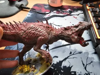 Figura de dinosaurio detallada, hecha de silicona. - Tamaño aproximado de 80mm de alto y 120 mm - Base escénica con vegetación. -Pintada a mano
