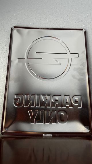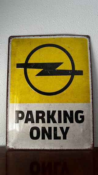 Placa metálica vintage de Opel con el logo y el texto PARKING ONLY. - Diseño retro. - Ideal para coleccionistas o decoración.