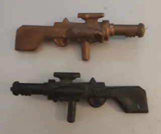 Lote de dos armas de plástico, una en color bronce y otra en negro, compatibles con figuras de Transformers y G.I. Joe. Artículo exclusivo, raro, difícil de saber si son Transformers ó Gi-joe. Creo que son Transformers, pero no lo puedo corroborar. Años 80-90, en muy buen estado. Para envío económico preguntar.