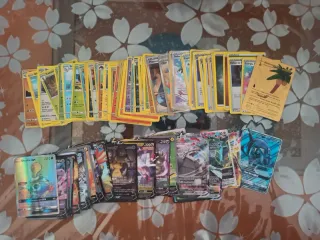 Lote variado de cartas Pokémon. - Incluye cartas de diferentes tipos y entrenadores. - Algunas cartas son brillantes y especiales. Cartas variadas, 21 entrenadores, 41 normales, 19 V, 6 V Max, 4 V Astro, 1 EX, 1 GX, 1 GX arcoiris, 1 dorada. Todo 8€