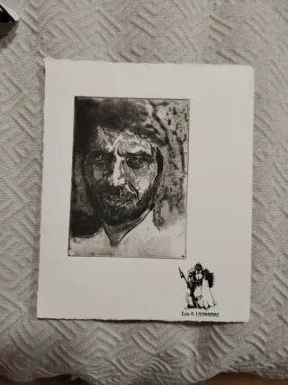 Grabado original del artista Luis A. Lasmarias. - Representación artística de Camarón de la Isla. - Firma del artista visible en la parte inferior derecha.