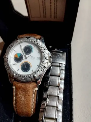Reloj Lotus con diseño deportivo y detalles en la esfera. - Caja de acero inoxidable. - Correa de cuero marrón. - Segunda correa de acero. - Esfera blanca con subesferas. - Bisel con marcadores.
