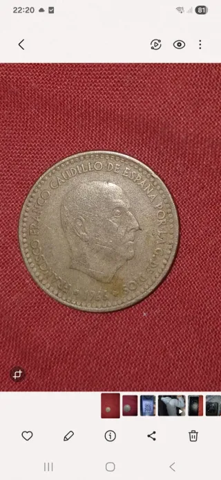 Moneda de peseta española del año 1966. - Anverso: Retrato de Francisco Franco. - Reverso: Escudo de España. - Inscripción: FRANCO CAUDILLO DE ESPAÑA POR LA G. DE DIOS 1966 SOL