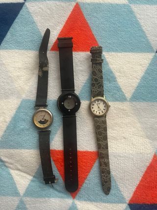 Lote de tres relojes para piezas o reparación. Ideal para manitas o aficionados a la relojería. En mal estado o no funcionan Escucho ofertas - Reloj con correa negra y esfera dorada. - Reloj con correa negra y esfera negra. - Reloj con correa estampada y esfera blanca.