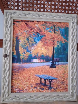 Preciosa pieza realizada de forma artesanal para conseguir un conjunto exclusivo y muy ORIGINAL ANTIGÜEDAD VINTAGE Es una puerta ventana donde se puede exhibir un recuerdo o fotografía a la par que por dentro tiene 3 colgadores / Se puede adaptar a una pared o cualquier tipo de mueble como complemento / Entrada o recibidor para colgar llaves joyas o lo que se le ocurra Hecho a mano sobre un marco trenzado en color blanco roto envejecido / Todo en madera / Consta de bisagras para acoplar / Escena de paisaje muy real que parece pintada Parque otoñal que aporta color y vida a cualquier rincón MEDIDAS 25cm ANCHO / 30cm ALTO PERFECTO