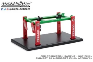 Réplica de elevador de taller con temática Texaco, escala 1/64. - Diseño detallado con colores rojo y verde. - Base negra para exhibición.