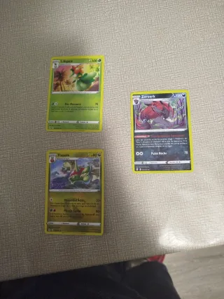 Conjunto de tres cartas Pokémon. - Carta Pokémon de Lilligant. - Carta Pokémon de Flapple. - Carta Pokémon de Zoroark.