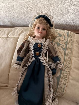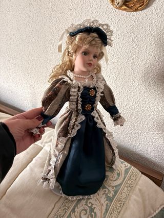 Preciosa muñeca de porcelana con un vestido detallado. - Altura aproximada de 45 cm. - Vestido de época con encajes y detalles. - Cabello rubio y ojos expresivos.