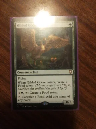 Carta de Magic The Gathering, Gilded Goose. - Tipo: Criatura - Pájaro. - Habilidad: Vuela. - Efecto al entrar: Crea un token de Comida. - Habilidad de token de Comida: Sacrificar por 3 vidas. - Coste de maná: 1 verde, sacrificar token de Comida para crear otro. - Coste de maná: sacrificar token de Comida para añadir un maná de cualquier color. - Poder/Resistencia: 0/2.