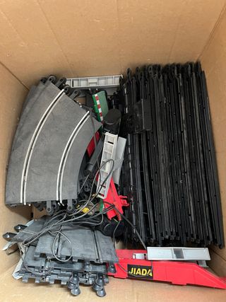 Conjunto de piezas para circuito Scalextric. - Variedad de tramos de pista. - Accesorios y soportes. - Cables de conexión. PIEZAS: 18 curvas 15 largas 5 cortas 2 mandos Adaptador