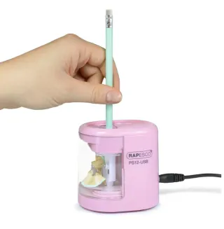Sacapuntas eléctrico automático en color rosa, ideal para la oficina o el hogar. Con carga USB o baterias (no incluidas) color rosa Ideal para lapices de 6mm a 8mm - Diseño compacto y moderno. - Depósito transparente para ver el nivel de virutas. - Con carga USB o baterias (no incluidas) DOBLE ALIMENTACIÓN - El sacapuntas eléctrico se puede alimentar mediante un cable USB (incluido) o, para portabilidad, se pueden utilizar 4 pilas AA (no incluidas); Afila una media de 10 a 12 lápices por minuto SEGURIDAD - Proyectado con una función de apagado automático que detiene el funcionamiento