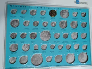 Colección de monedas que recorren la historia de Alicante. Soporte, moneda y dos billetes