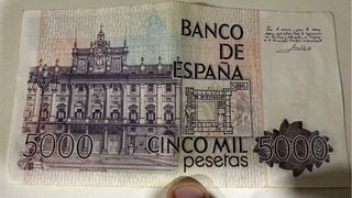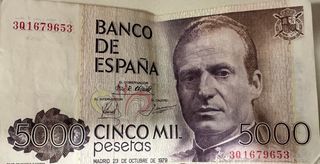 Billete de 5.000 pesetas del Banco de España, emitido en Madrid el 23 de octubre de 1979. Presenta el retrato de Juan Carlos I. - Serie: 3Q1679653 - Fecha de emisión: 23 de octubre de 1979 - Banco emisor: Banco de España - Valor: 5.000 pesetas