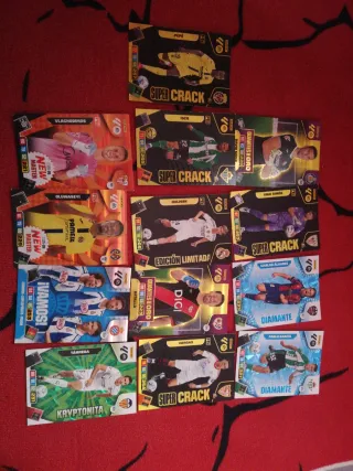 Lote de cartas de fútbol Panini Adrenalyn XL de la temporada 2025-2026. Incluye varias cartas 'Super Crack', 'Diamante' y 'Edición Limitada'. - Cartas de jugadores como Pepe, Isco, Unai Simón, Carlos Álvarez, Pablo García, Vargas, Olusewi, Tárrega, Huijsen, Vlachodimos. - Cartas especiales: 'New Master', 'Guantes de Oro', 'Kryptonita', 'Batalla'. - Incluye cartas de edición limitada y de alta puntuación.