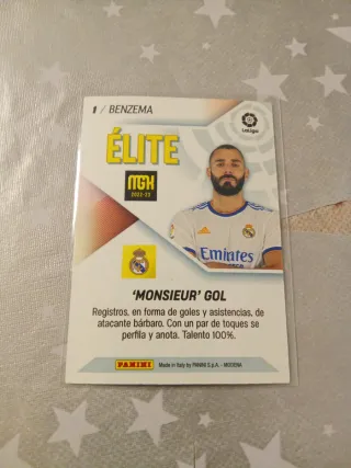 Tarjeta de colección Panini Élite de Karim Benzema, temporada 2022-23. - Diseño Élite. - Incluye escudo del Real Madrid. - Logotipo de LaLiga Santander.