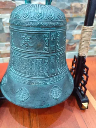 Auténtica campana tibetana de bronce con un soporte de madera oscuro y un mazo. - Diseño tradicional con inscripciones. - Soporte de madera tallada. - Incluye mazo para tocar la campana. Sonido bonito diámetro de la campana 17'5 cm y la altura 20 cm. Peso 1750 gramos. El soporte mide 24'5x29x11'5 cm
