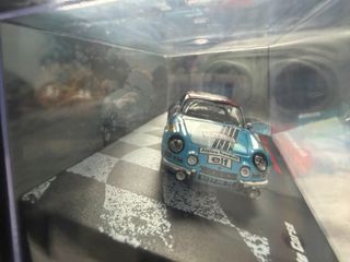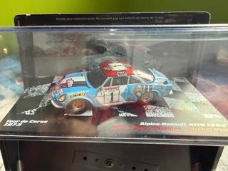 Réplica a escala 1:43 del Alpine-Renault A110 de rally. - Modelo: Alpine-Renault A110 1800. - Edición: Tour de Corse 1973. - Pilotos: Jean-Pierre Nicolas y Michel Vial. - Decoración: Azul, blanco y rojo con patrocinadores. - Incluye base expositora con nombre del modelo y evento.
