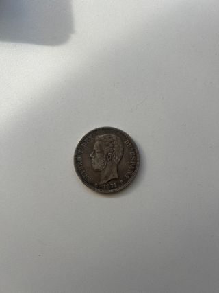 Moneda española de 5 pesetas del año 1871. Presenta el busto del rey. - Anverso: Busto del rey. - Reverso: Escudo de España. - Año: 1871.