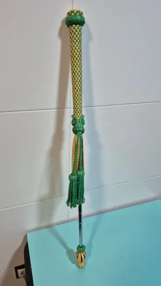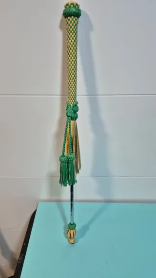 Cachaba decorativa con un diseño trenzado en verde y naranja. Presenta detalles de borlas y adornos. - Mango trenzado en verde y naranja. - Borlas decorativas en naranja y verde. - Eje metálico.