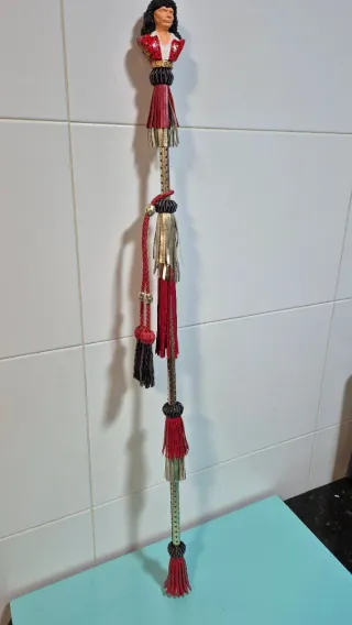 Cachaba decorativa con una figura en la parte superior y flecos. - Figura detallada en la parte superior. - Flecos de colores rojo, negro y plateado. - Elementos decorativos colgantes.