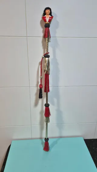 Cachaba decorativa con un diseño elaborado y detalles llamativos. - Empuñadura trenzada con remates. - Borlas de hilo oscuro. - Varilla metálica.