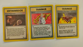Conjunto de tres cartas de entrenador de Pokémon. - Carta Fósil Misterioso (Entrenador). - Carta Blaine (Entrenador). - Carta Cinnabar City Gym (Stadium Card).