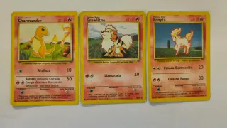 Se venden tres cartas Pokémon: Charmander, Growlithe y Ponyta. Muestran señales de uso, como se aprecia en las imágenes. - Carta Charmander (Básico) - Carta Growlithe (Básico) - Carta Ponyta (Básico)
