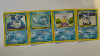 Lote de 4 cartas Pokémon: Dewgong, Poliwhag, Squirtle y Wartortle. Presentan señales de uso. - Carta Dewgong: Ataques Rayo Aurora (50) y Rayo Hielo (30). - Carta Poliwhag: Ataque Pistola Agua (10+). - Carta Squirtle: Ataques Burbuja (10) y Refugio. - Carta Wartortle: Ataque Mordisco (40).