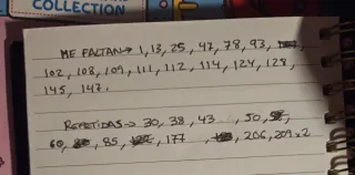 LEER ANTES DE COMPRAR. Venta e intercambio. ME FALTAN: 1-13-25-47-78-93-102-108-109-111-112-114-124-128-145-147 REPETIDAS: 30-38-43-50- -60-85-122×2-177-206-209x2 En la foto tb podéis ver las repetidas y las que me faltan. Precio por unidad 0,20. Si os lleváis 6 un euro.